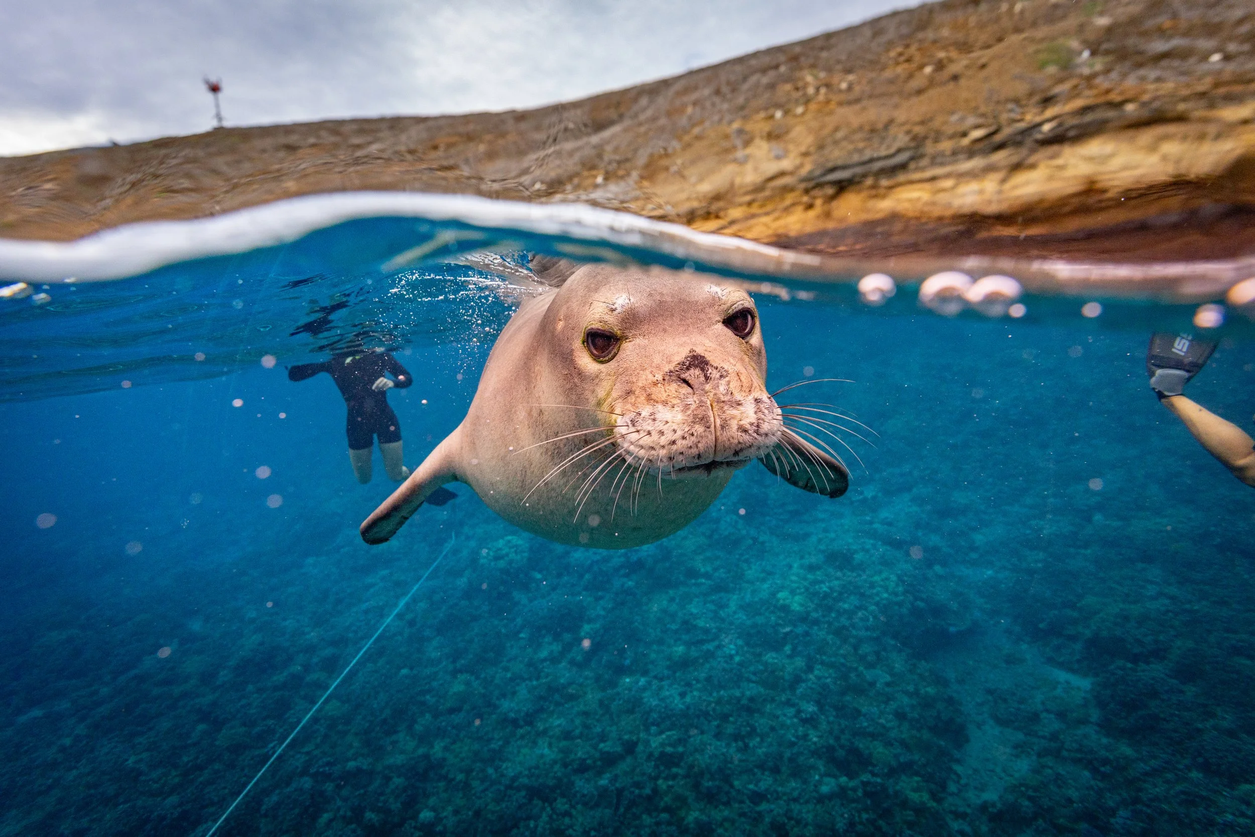 Hawaiian Monk Seal at Molokini Crater. Trilogy follows NOAA marine wildlife viewing guidelines. All photos shown here were taken from a responsible distance. The Hawaiian monk seals in these images approached the photographer naturally — we did not chase, pursue, or disturb any monk seals.