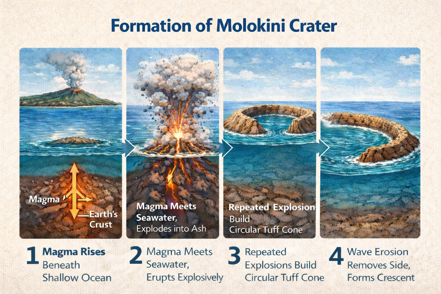 Molokini formed when magma rising through the seafloor interacted with shallow ocean water. When hot magma met cold seawater, the water rapidly turned to steam, creating powerful explosions that shattered the magma into ash and rock fragments. These fragments settled around the eruption site, gradually building a circular ring of volcanic material above the ocean surface.