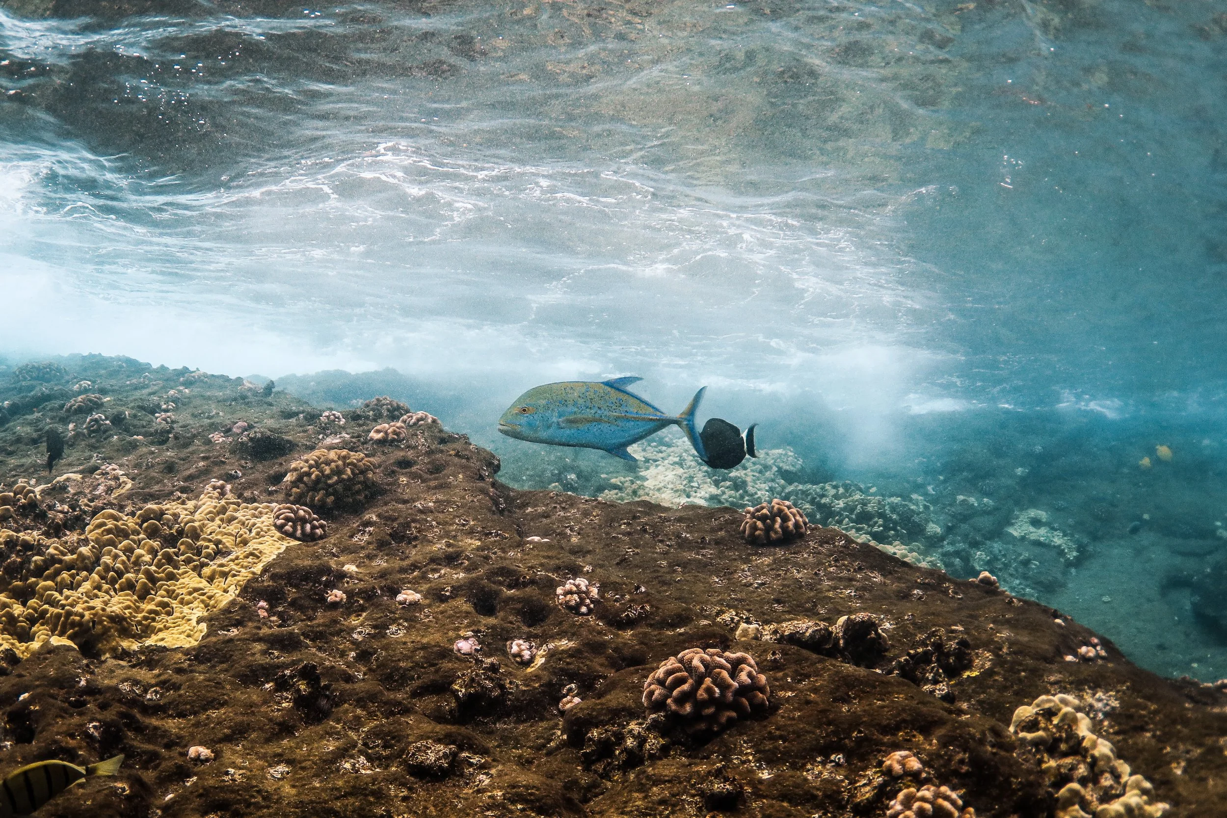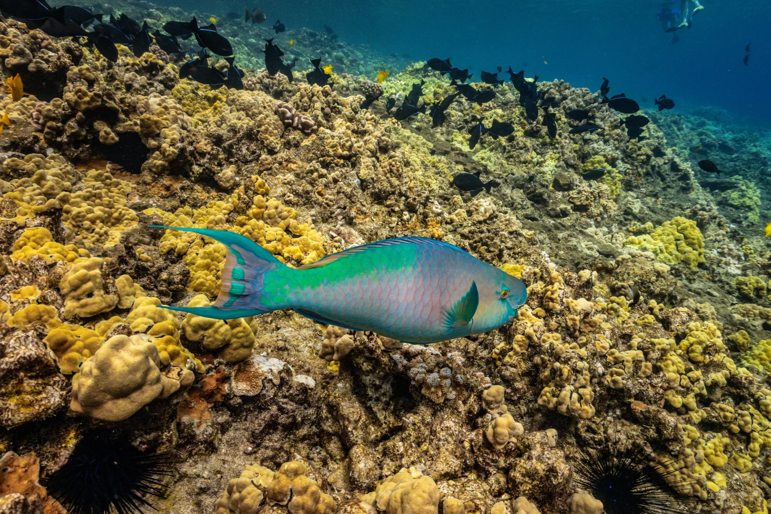 Inside the crescent, the reef slopes gradually through clear water where schools of reef fish move along coral heads and lava rock ledges. Snorkelers commonly see species like Yellow Tang, Parrotfish, Butterflyfish, and Moorish idols, along with groups of Surgeonfish, Goatfish, and different types of Trigger Fish weaving through the reef structure. Because the crater is protected as part of the Molokini Marine Life Conservation District, fishing and collecting marine life are restricted, which helps the reef community remain healthy and diverse.